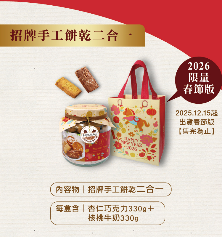 (春節獨享價)招牌手工餅乾-二合一 (罐裝)杏仁巧克力+核桃牛奶-2026春節禮盒