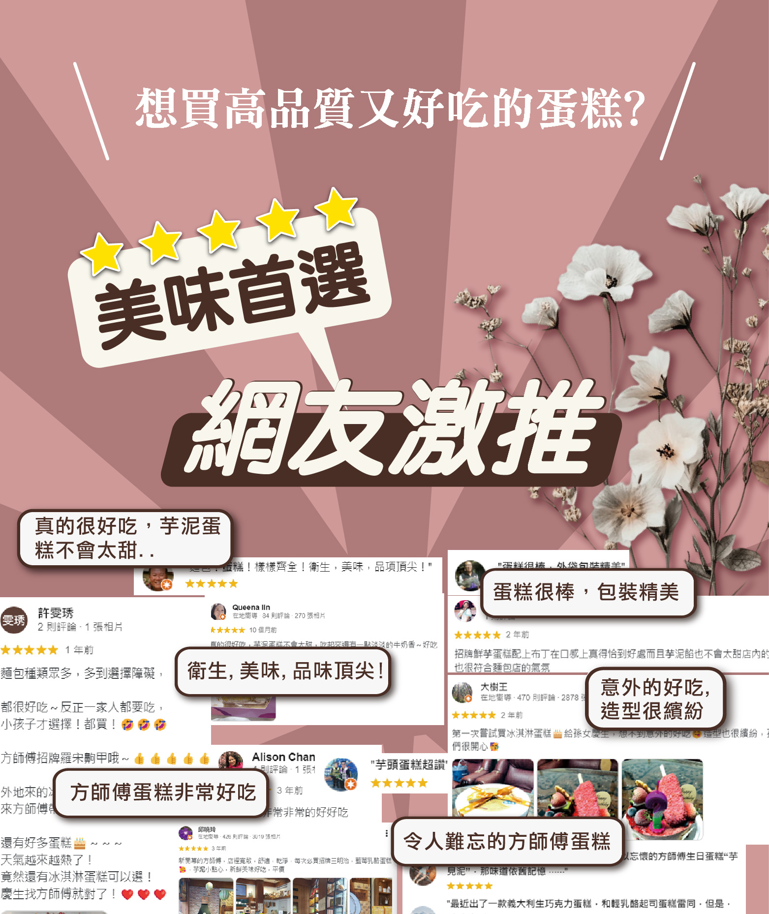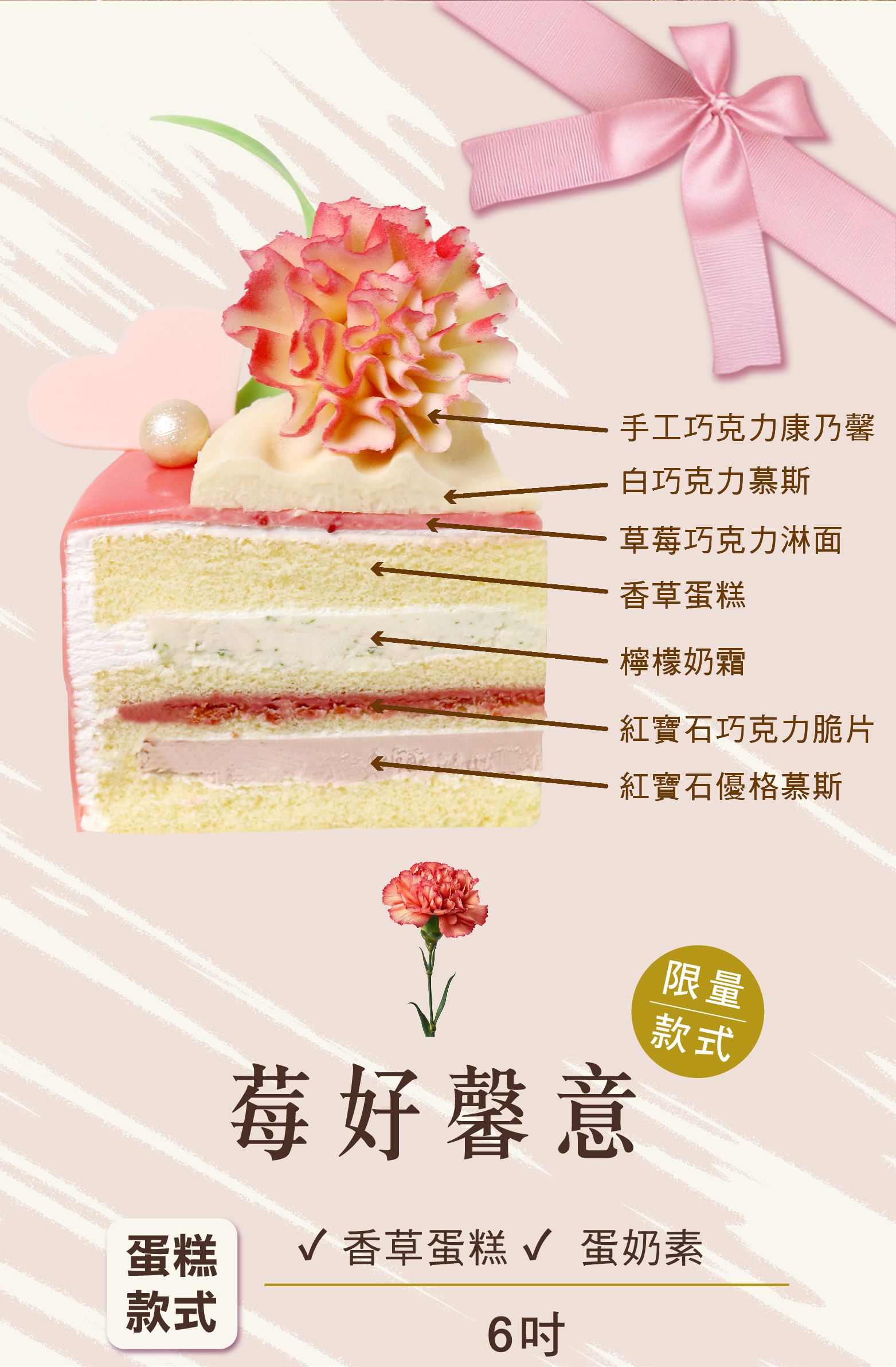 莓好馨意:愛樂薇鮮奶油、蛋、純白巧克力、蛋糕粉、脂肪抹醬、嘉麗寶紅寶石巧克力、草莓巧克力風味片含果粒、沙拉油、調和乳、嘉麗寶28%純白巧克力鈕扣、愛樂薇馬斯卡邦、水、草莓巧克力風味片、橄欖油、檸檬汁、麥芽、希臘式優格、糖、巴芮脆片、葡萄糖漿、乳化劑、藍莓粒、發酵奶油、鏡面果膠、寒天慕斯凝固膠粉、水蜜桃汁、巧克力飾片、煉乳、胡麻油、柑橘果膠、檸檬皮、鹽、草莓紅可可脂、食用紅色六號